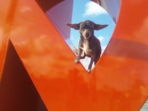 Yoga and I spent a couple of hours at the event, but the baby demanded to stop by the park on the way home. She was so good the entire afternoon that I could not deny the little blue some fun. We took the long way back to the apartment, but before we left I had to get a photo of her near this giant, orange peace sign, provided by Luis Jimenez Sculptures. She was a little scared, but the photo was so cute I died a little.
