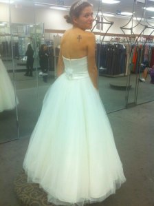 The coolest part? There was no mirror in the changing room, so the first reaction I ever got was Emily’s. I’d come of out the little closet and immediately look to her for an opinion, which kind of helped me judge what I would think upon seeing the dress. (Yeah, she has that much of an influence over me, and I really just want her to think I’m pretty on my wedding day. Is that so insane?) We immediately sent all of the photos we took to Steve and Judy, but as they had completely conflicting opinions, I really don’t know what that to take away from it all…