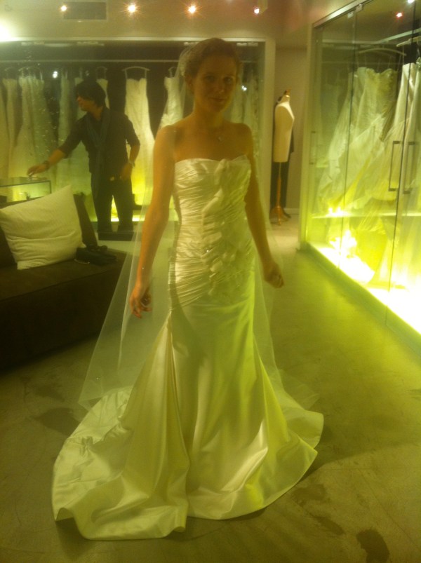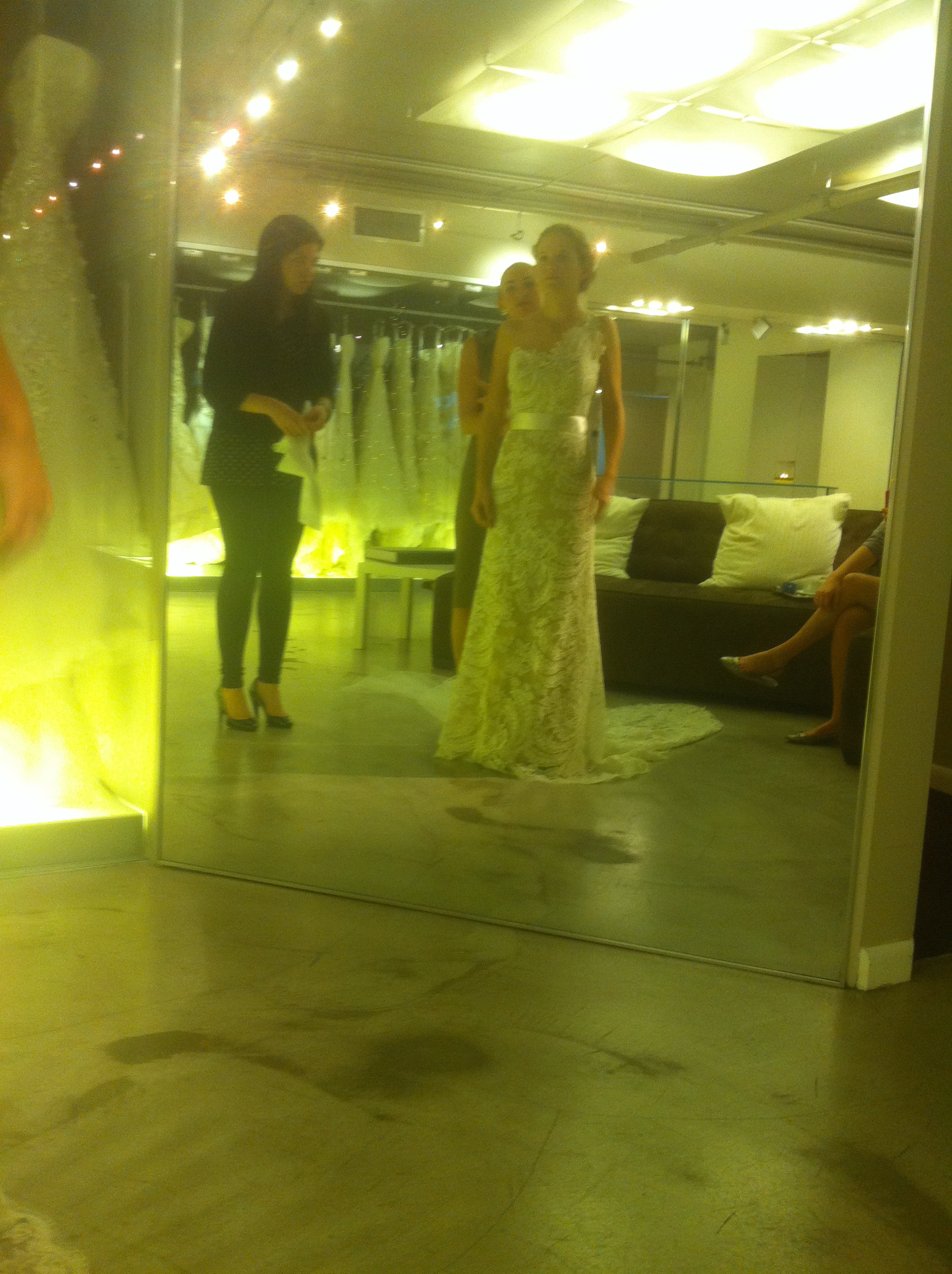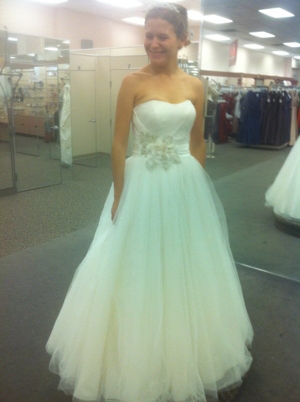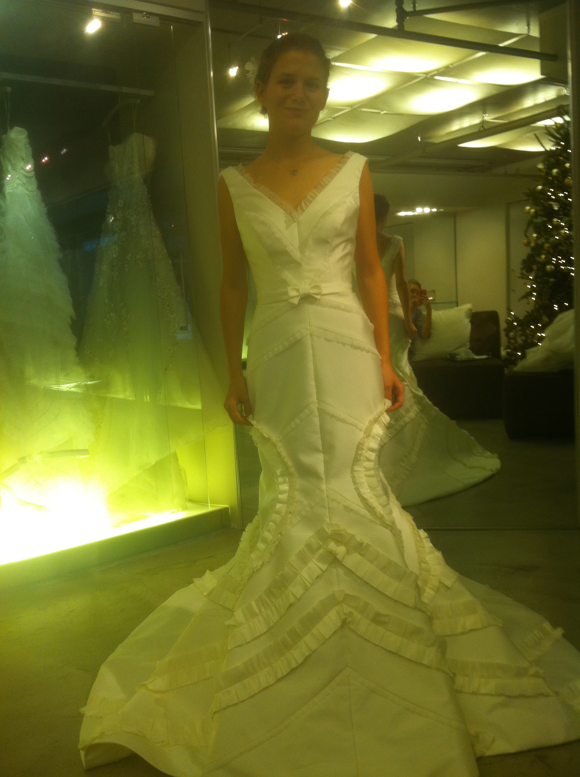 As many of you know, in December my little sister (to be) came down to Miami and helped me look for wedding dresses. (Ok, that’s not why she came. She came to go on a winter cruise to Cozumel with her hunky boyfriend. But she helped me all the same.) We spent two weekends searching through rack upon rack of white gowns, and after trying on close to 30, I’m here to report on what we found. Keep in mind that while I’m posting close to everything I tried on, there are only a few that are real contenders. The first of which, is definitely not one…