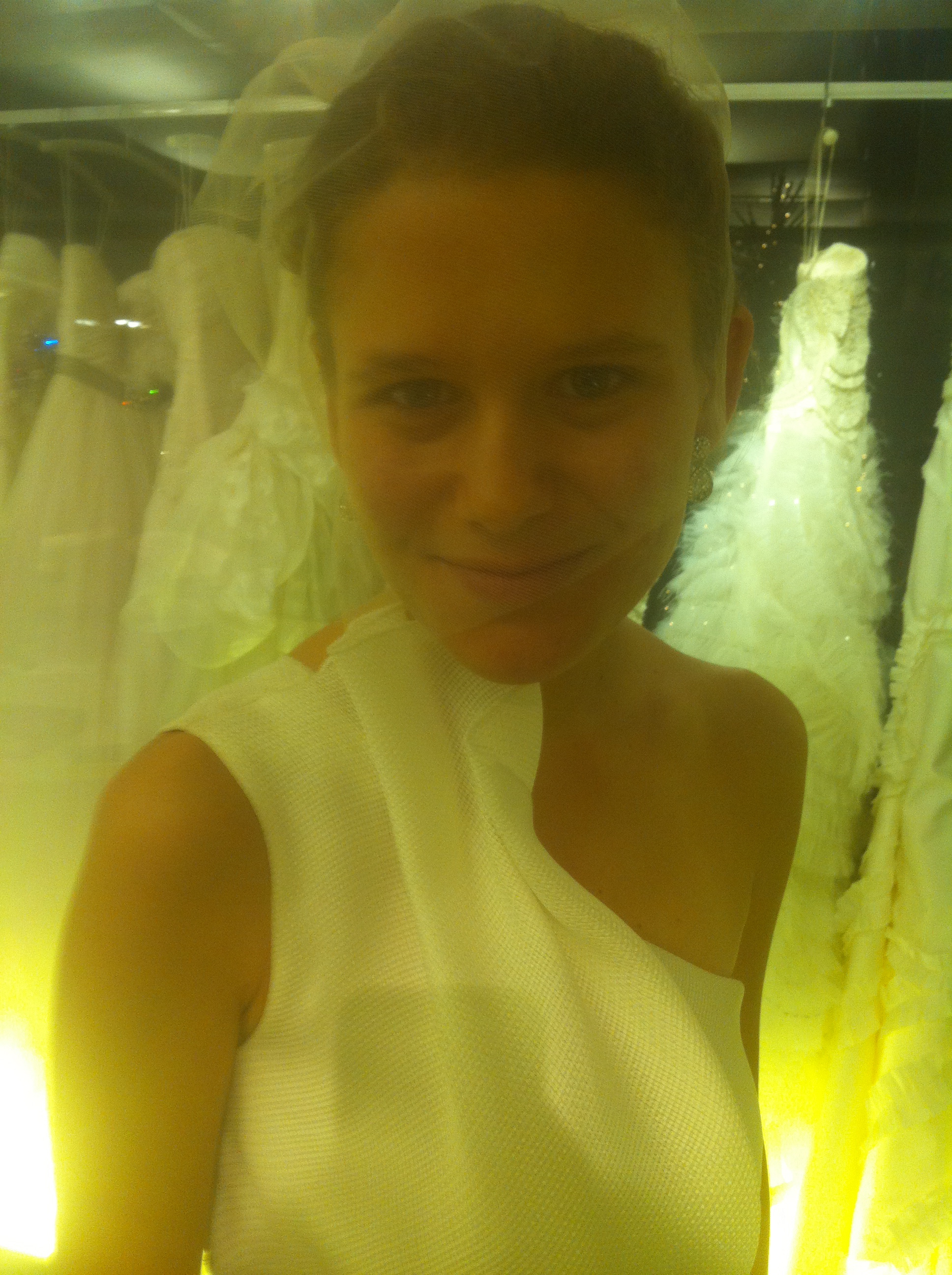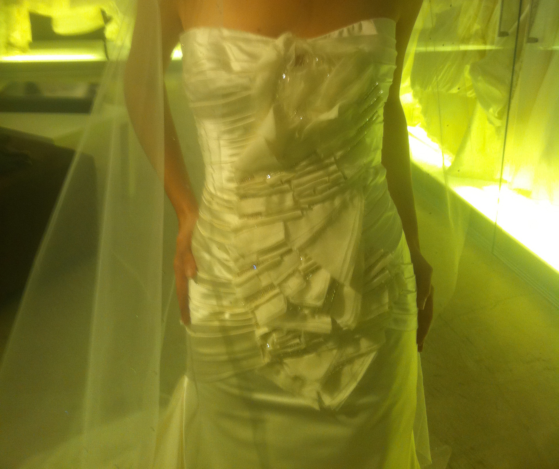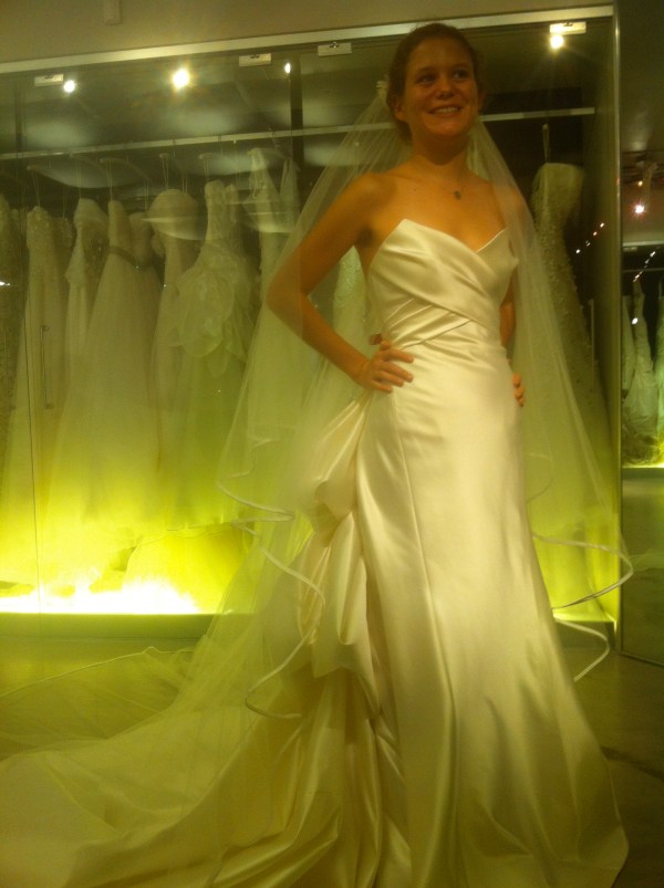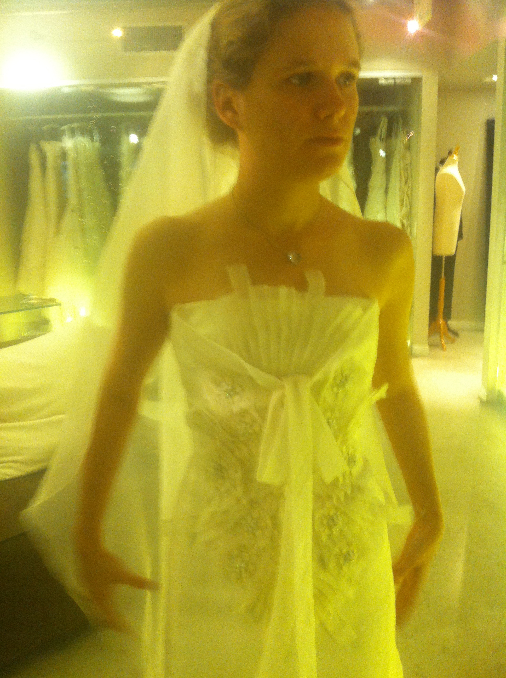 As many of you know, in December my little sister (to be) came down to Miami and helped me look for wedding dresses. (Ok, that’s not why she came. She came to go on a winter cruise to Cozumel with her hunky boyfriend. But she helped me all the same.) We spent two weekends searching through rack upon rack of white gowns, and after trying on close to 30, I’m here to report on what we found. Keep in mind that while I’m posting close to everything I tried on, there are only a few that are real contenders. The first of which, is definitely not one…