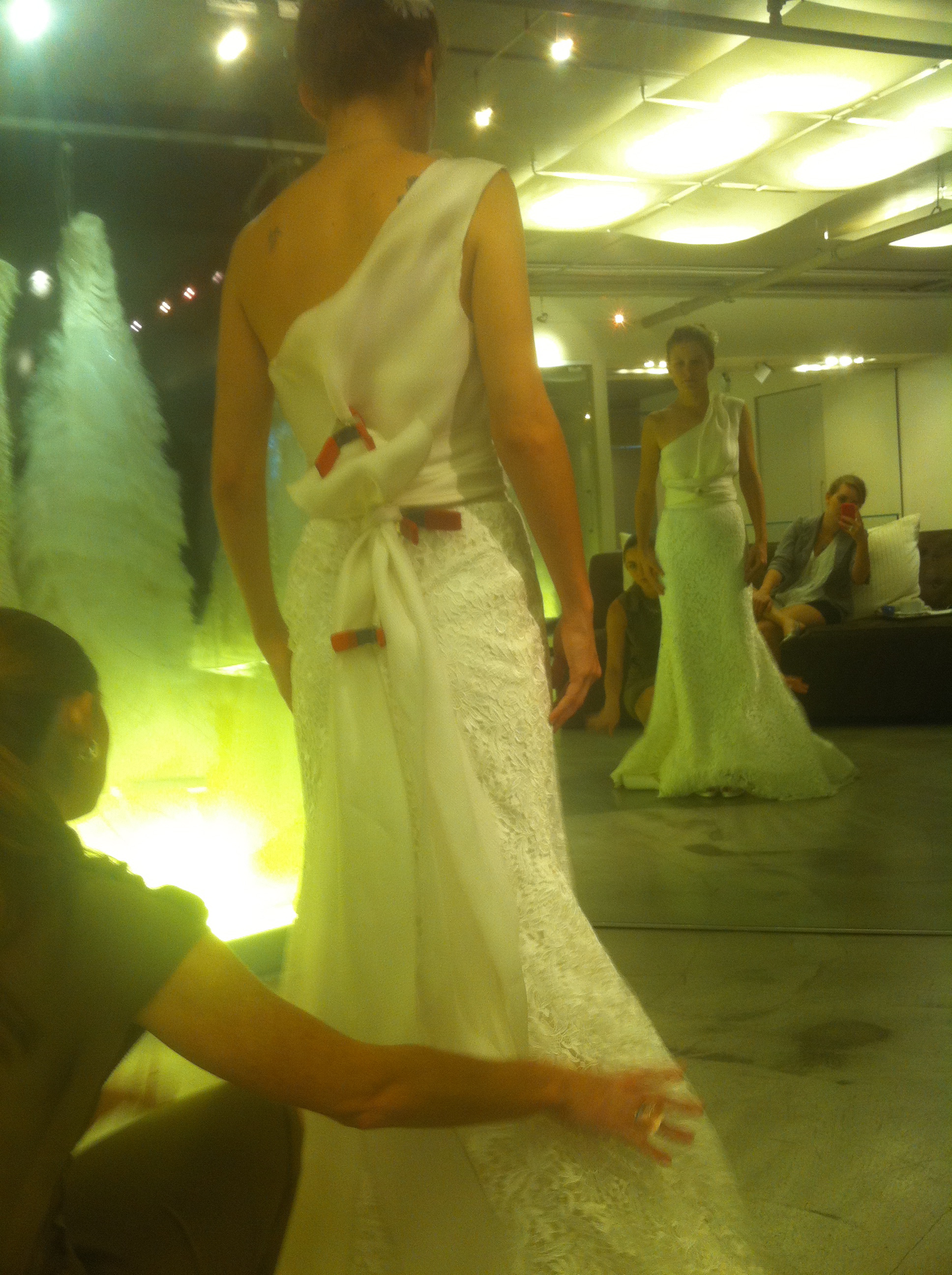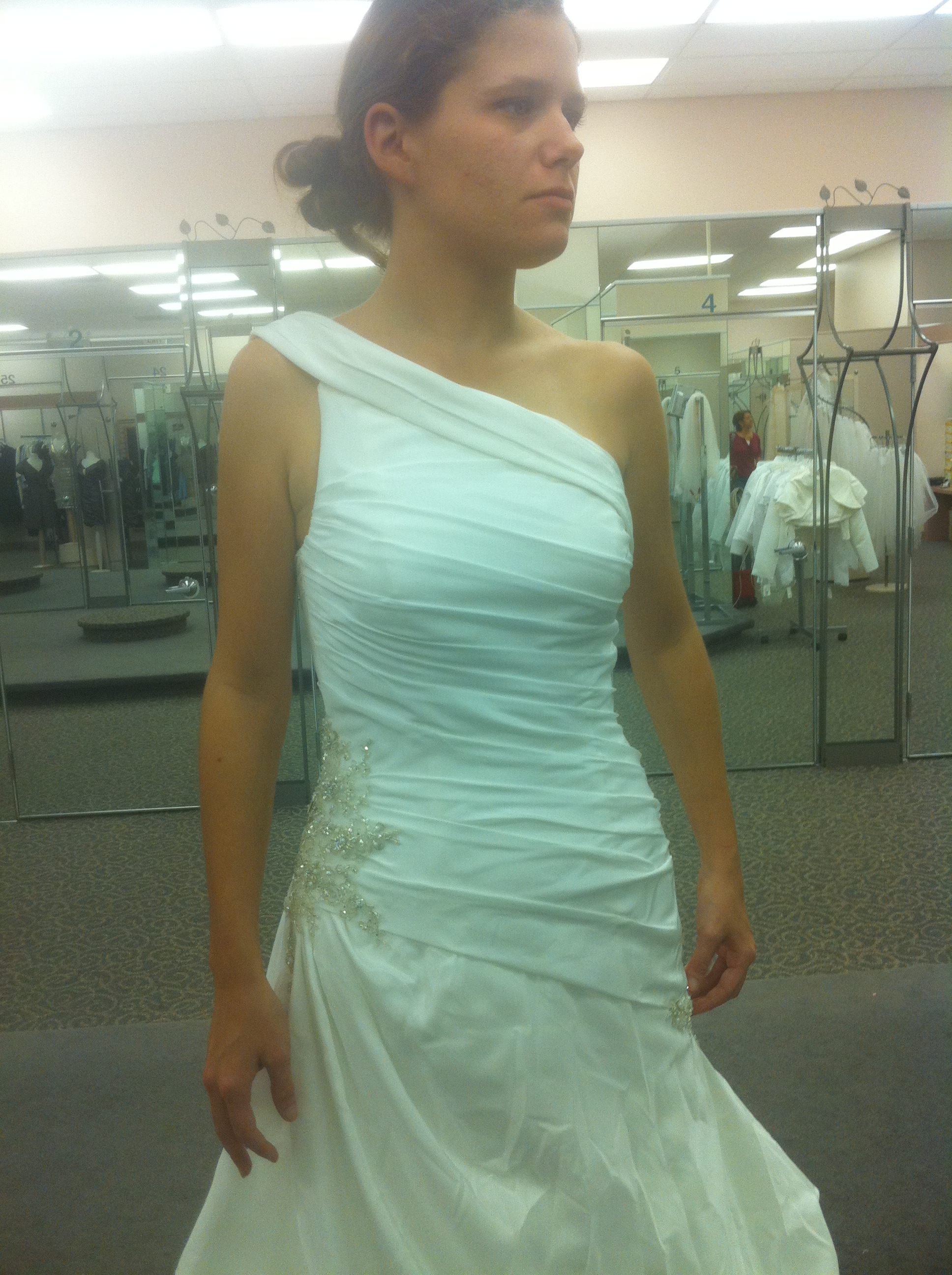 This one, which was one of the first that I tried on at this ridiculously expensive shop in Coral Gables, Ever After, is very similar to the last. (At about 10 times the price). I don’t love the single shoulder, but I do love the color. I’ve never desired or required the typical wedding dress, so sticking to white isn’t important to me. Standing out, however…