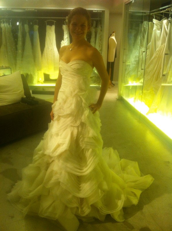 These are some more of the Ever After dresses. As soon as I stepped into the appointment, I knew everything in the store was way too rich for my blood, so I decided to have fun with it. I tried on anything and everything the consultants suggested and posted a few for your viewing enjoyment. Keep in mind that many of these are wrong on multiple levels and that none of them are any that I would ever consider. I was having a Pretty Woman moment and enjoying every second of it. I mean, how many opportunities does a girl have to try on a Vera Wang gown? (Hopefully only one…)