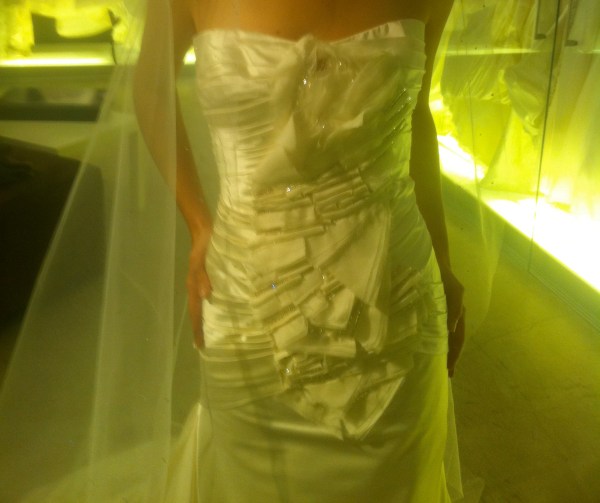 Ok, ok. This was Steve’s top pick, but as much as I hate to say it — not really a contender. It’s a beautiful dress, but it’s a bit too trendy for my taste. And a little too heavy for a summer wedding in Miami.