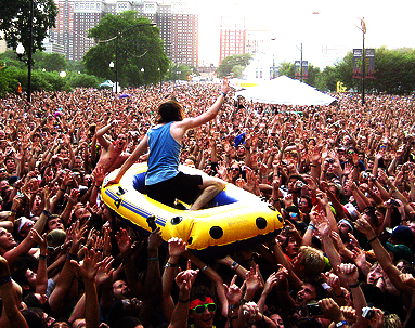 “Festivals are almost a lot easier for me, since the clubs are so chaotic. At my shows a lot of people jump onstage, toss drinks around. I’m cool with that and I love it, but it also increases the level of difficulty a good bit when people are running into me and screaming in my face. At a festival the audio’s usually crystal clear. There’s tons of people, but it’s not as nuts. So it makes it so much easier for me to physically perform. And a lot of the stuff I play is obviously pop hits, which can be refreshing for the crowd. You know, all the bands playing All Points West are great, but you’re probably not going to hear “Come On Ride It (The Train)” anywhere else that day.” — Gregg Gillis aka Girl Talk (2008).