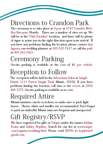As I’ve said before, the ceremony is going to be at Club Paradise in Crandon Park at Key Biscayne. Since it’s going to be extremely hot, and since no one really cares about the part where you actually get hitched, Addam and I have decided to push for a quick ceremony. (This is no royal wedding folks — so feel free to leave the hymns at home.)