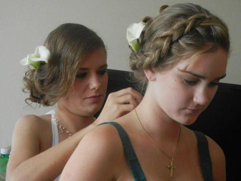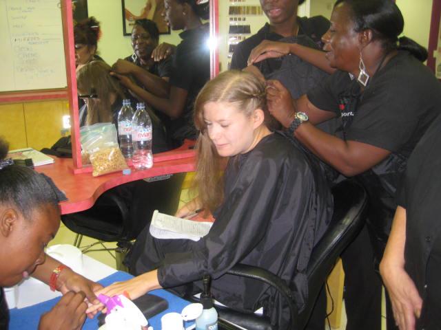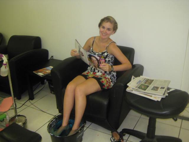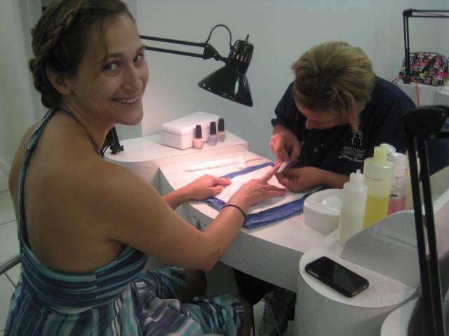 As soon as we got to the Hilton, the girls (Heather, Emily, Courtney and myself) hopped in JoAnn’s car and headed to a beauty school to get our hair did. Katie met us there shortly after, and by 10:30 or 11 a.m. we were seated and ready to go. JoAnn surprised us with manicure and pedicures, so we definitely got the star treatment.