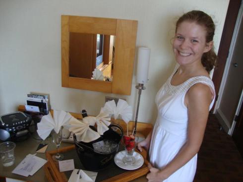 The room was absolutely gorgeous, but nothing could compare to our amazing view! We were on the eighth floor, and our room looked out at both an Olympic-sized pool and the ocean. Hotel management surprised us with a bottle of champagne and some fresh strawberries, so after resting up Addam and I went down to the beach to get our honeymoon started right.