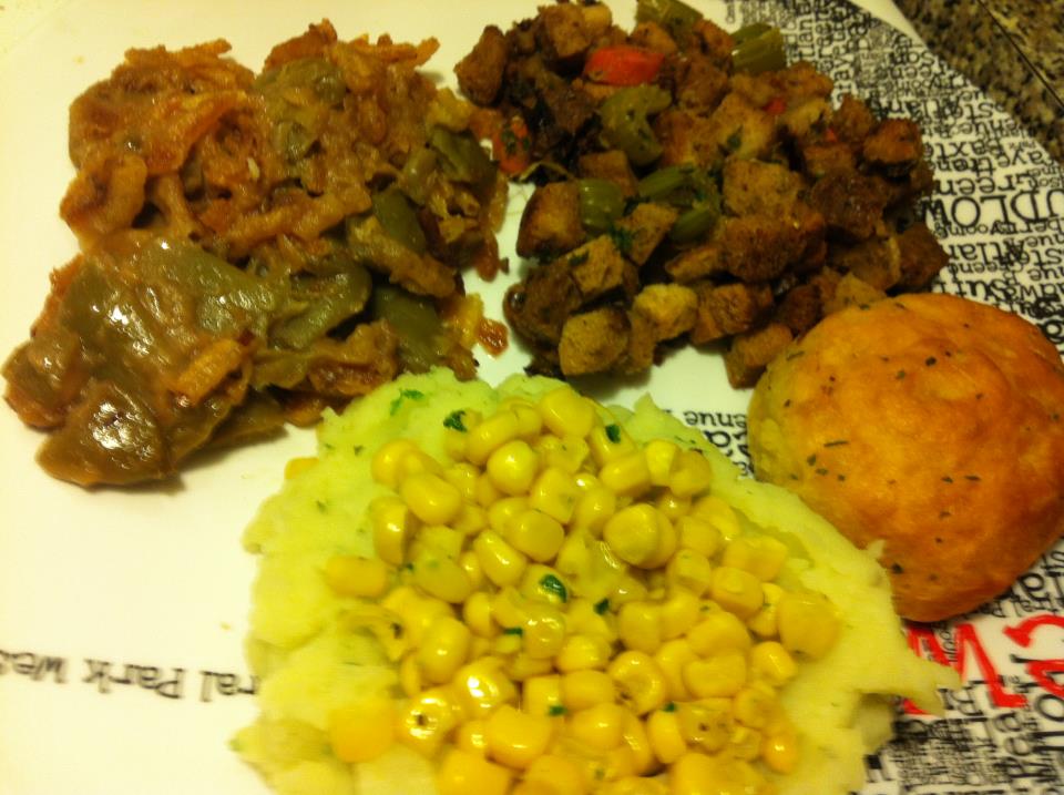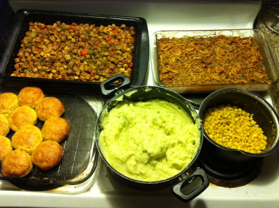 We made (vegan) stuffing, green bean casserole, seasoned corn, garlic mashed potatoes and biscuits. Addam didn’t feel like spending the day on a turkey, so he grilled up a steak, and we called it a dinner. I was worried how everything would turn out, as it was my first holiday without cheese, milk and eggs – Thanksgiving strongholds. Fortunately, everything came out even better than I imagined. I may even sneak in some vegan options over Christmas, when Addam and I will be cooking for the entire Evans clan. (Addam absolutely abhors green bean casserole, and even he had to admit that it was the best I’ve made – a huge compliment given the source.)