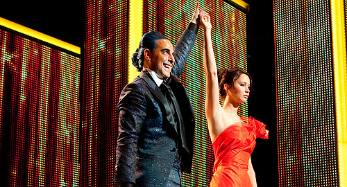 After training the tributes are dolled up to conduct a live interview with Caesar Flickerman — the face of the Hunger Games. Cinna strikes again with Katniss’s dress — creating a flowing red number that flares up when she spins on stage. As the book describes it, Katniss appears to catch fire — which could easily appear over the top on film. I can’t wait to see how it turns out.
