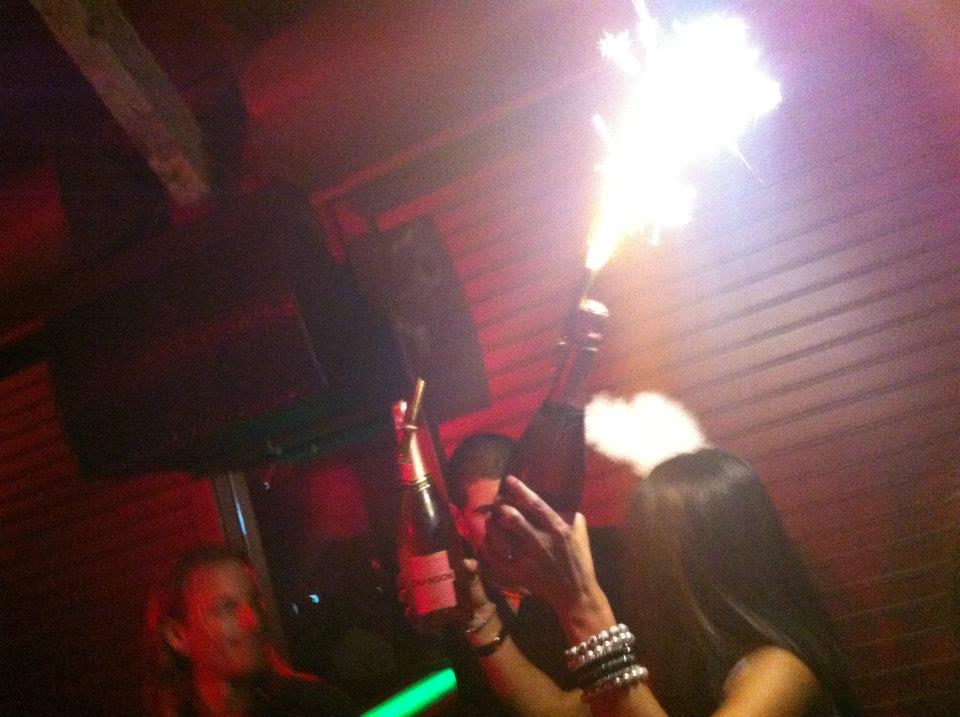 We got to the club around midnight and were escorted past a gigantic line, straight to our table. A tiny girl in an even tinier outfit promptly brought out two bottles of champagne and some strawberries — complete with sparklers — to set off the celebration.
