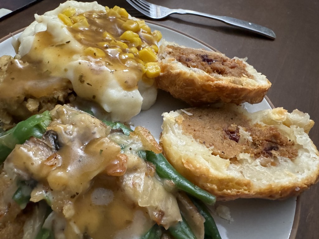 I was ballin’ on a budget this year, but I made sure to get all of my staples in, including a hazelnut and cranberry field roast en croute. The cranberry core and flakey crust was a nice addition to my typical Tofurky. I finally managed to make a reasonable serving of green bean casserole for one person, but I could have fed a five-person family with the amount of mashed potatoes I brought to the table. (The funniest thing is, I almost didn’t have mashed potatoes at all! When I picked up groceries over the weekend I somehow forgot to grab my bag of spuds on the way out the door. I didn’t realize my mistake until Wednesday night, and rushed back just in time.)