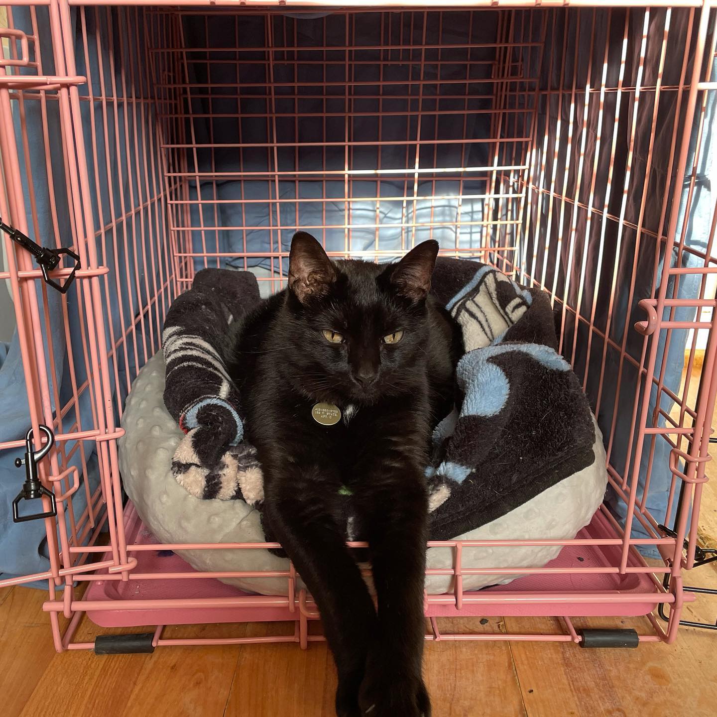 As soon as I arrived at ACCESS they brought me into the back room and opened up Woodward’s cage, where he was laying with a thick blue collar, holding his un-used feeding tube in place. He wasn’t facing the door but as soon as he felt my touch he looked up and knew it was me — his momma. The smell of the place was so overwhelmingly sterile and I hated even more in that moment that this is where my poor boy had to spend his last three days on this world, rather than at home, with his family who truly loved him. But the second his big eyes met mine and he felt my hand his whole body purred and it rumbled through my whole body. I leaned half of myself into his cage and laid as close to him as I could, reassuring him that I was there. I’d come back. I hope he knew the whole time that I’d always come back.