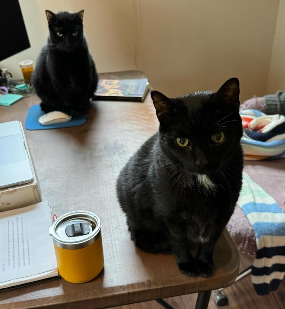 The mornings and the evenings are the hardest. Woodward seldom fell asleep with me, but he was sleeping on the pillow next to mine every morning when I woke up. Bernie would sleep on top of me, but Woody’s spot was always by my side. Most mornings I even made the bed around him so that he could sleep a little longer. But he was also first to the food bowl. And every evening he was my desk cat. My study-buddy. My fellow reader and grader. He always had the spot to my left. It used to drive me nuts sometimes — to have this huge desk with access to such a small part of it. But it’s too empty without him here. I miss him always, but at these times it’s most obvious.