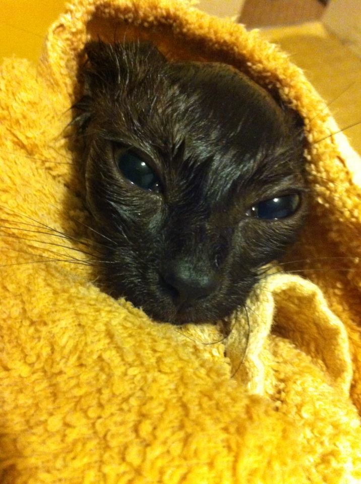 It takes three shots. The second put him to sleep and the third stopped his poor little heart. I held him the entire time, his little neck and head in the palm of my hand. Too small. After a minute the vet asked to check his heartbeat, but in a few seconds I could no longer feel his pulse in my palm, so I knew that he was gone. I can still feel his heart beat softening. I can still feel the steady rumble of his deep purr slow to a stop. I hope one day it doesn’t feel like letting him down.