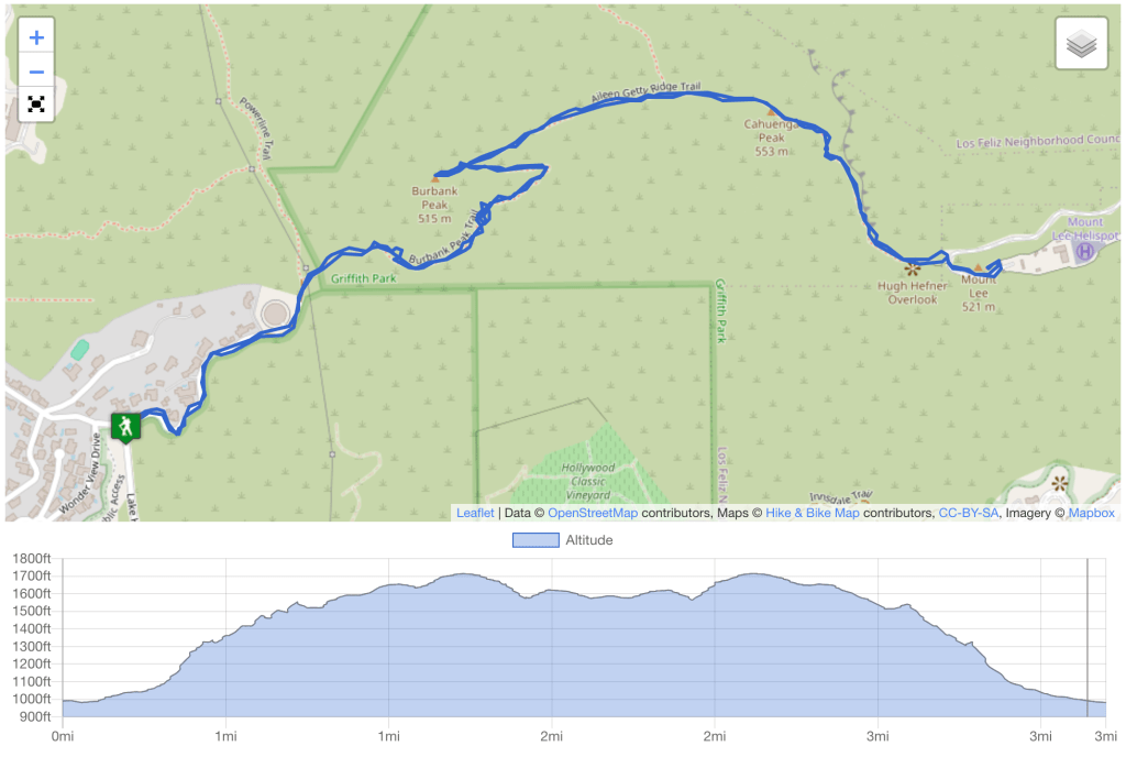 I mapped out my route and worked out a game plan on Tuesday night, and I have to thank the Social Hiker for making that part of the trip the least of my worries. Their blog post on the Burbank Peak, Cahuenga Peak, and Mt. Lee trek was easy to follow and kept me on the right path. I borrowed the two images directly above this paragraph from their site, which provides interesting data on the trail’s location and elevation.