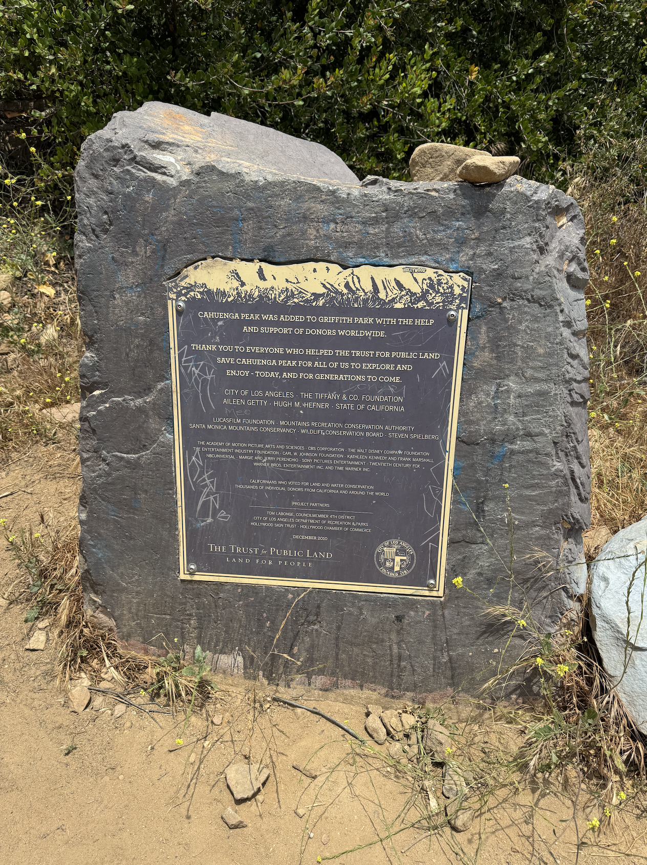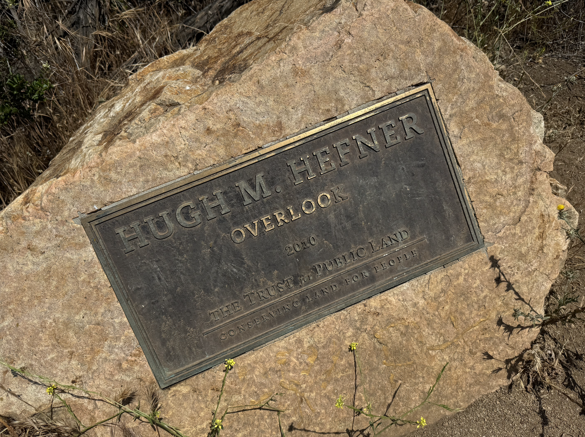 The tree is located on a 138-acre lot of land that also includes Cahuenga Peak — originally owned by Howard Hughes. In 2002 investors purchased the land with the intention of building additional luxury homes, but public concern caused the Trust for Public Land to purchase the land for Griffith Park. In 2010, with $1 million left to raise, Hugh Hefner contributed $900,000, facilitating the $12.5 million deal. This act preserved the area, integrating it into Griffith Park and ensuring continued public access to the Wisdom Tree and its surroundings. (This is also why there is an observation point dedicated to Hefner further down the trail. More on that later.)