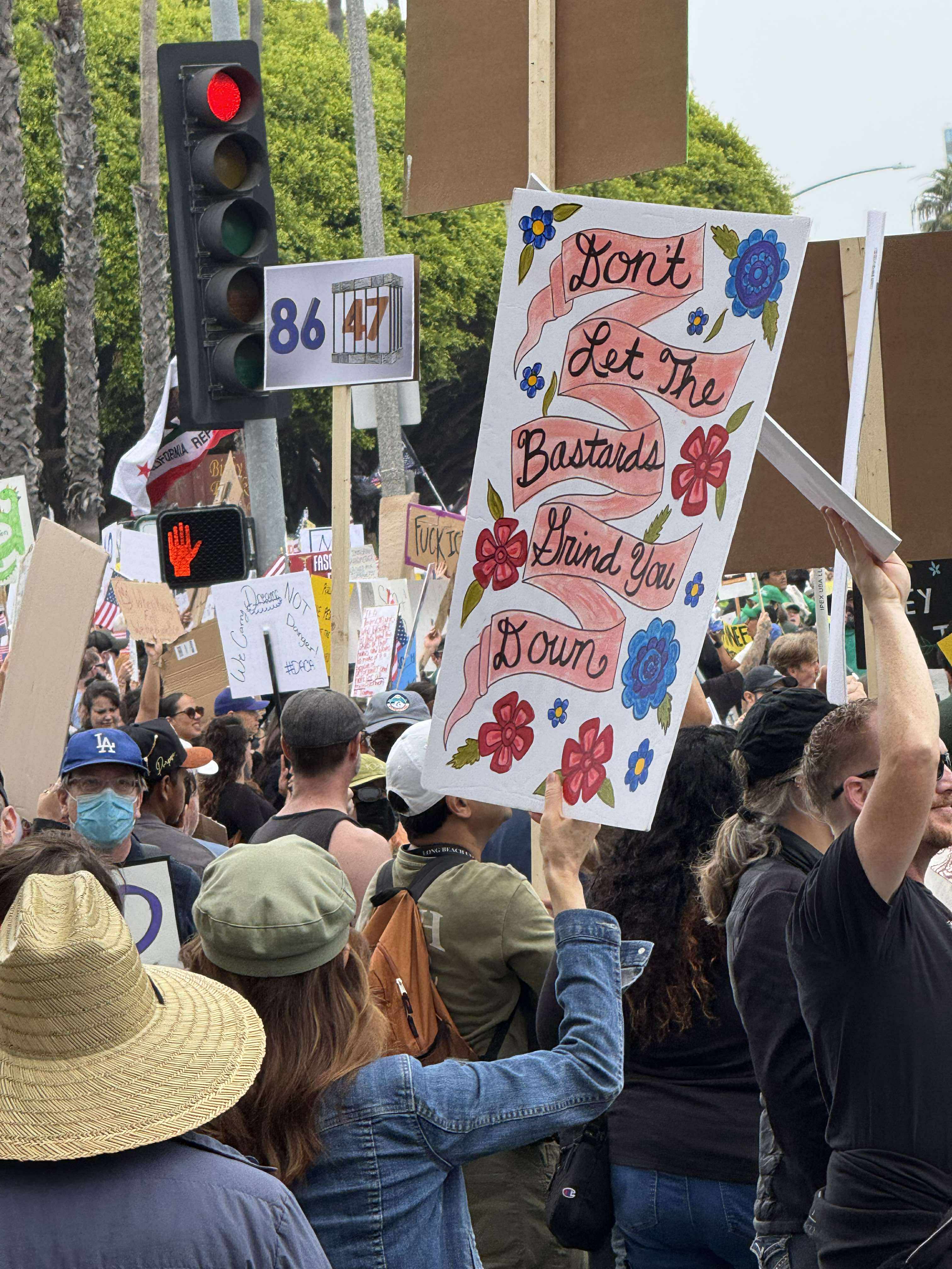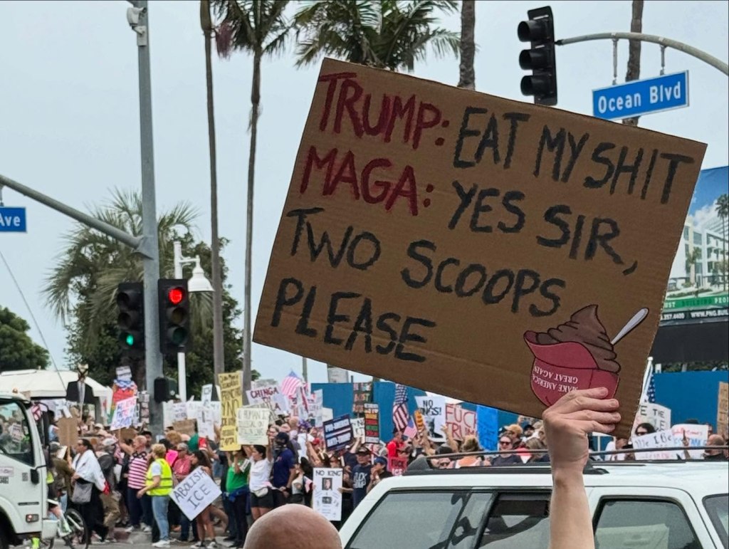 The energy and community was overwhelming, and it made me incredible proud to call Long Beach my home. (I say this all the time, but you would NEVER see this in Augusta. I’m pretty sure their pro-King and anti-First Amendment.) Half the cars that drove by were honking, flying anti-Trump/ICE signs, and cheering along out of their passenger windows. I saw quite a few bikers and motorcyclists participating in the movement as well, one wrapped in a pride flag! It literally felt like a parade. (Which is kind of ironic, considering Trump’s big authoritarian birthday bash was such a fucking bust! Womp womp!) I only saw one POS from MAGA drive by, with a red hat and giant American flags flying from the bed of their truck, but they hit a traffic light and were properly “SHAME”d by the crowd. (I gotta thank George R. R. Martin and Game of Thrones to that fun edition to modern protests). Overall, the energy was infectious, and I am very proud of my city.