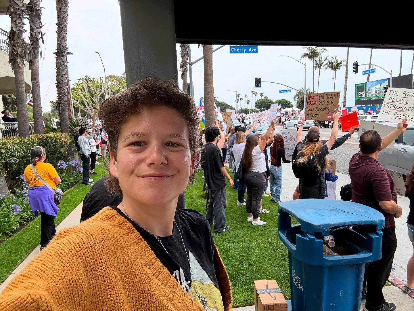 This week’s protest was the national No Kings movement, and though there were rallies across all of LA and Orange counties, I participated at the Long Beach location. The LB event was in Bixby Park and ran from 9 a.m. to 11 a.m. on Saturday, June 14, so I woke up early enough to enjoy a coffee and grab a good spot.